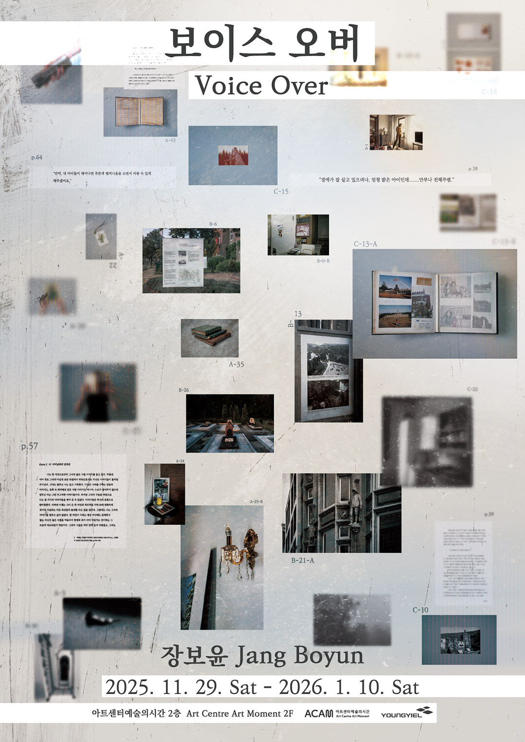 아트센터예술의시간은 2025년 11월 29일(토)부터 2026년 1월 10일(토)까지 장보윤 개인전 《보이스 오버》를 개최한다. 전시 《보이스 오버》는 장보윤이 2019년부터 2025년까지 약 7년간 지속한 작업 <블랙 베일>을 마무리하는 전시로 <블랙 베일> 연작 총 150여개 중 영상, 사진, 푸티지, 텍스트를 포함한 60여개의 작품을 한 자리에서 볼 수 있다. 장보윤은 우연히 습득한 타인의 사적 기록물에서 이야기를 시작하여, 그 장소로의 여행을 통해 개인의 역사를 취재한다. 이 과정을 통해 실재하는 기록과 기억의 틈, 그리고 과거와 현재를 오가는 시간과 공간을 픽션과 논픽션으로 채운다. 그의 작업은 사실과 허구의 공존 안에서 건져올린 이미지를 통해 구성한 개인의 내러티브가 사회, 문화, 역사적 알레고리로 읽히는 지점을 만나는 것에 집중한다.
