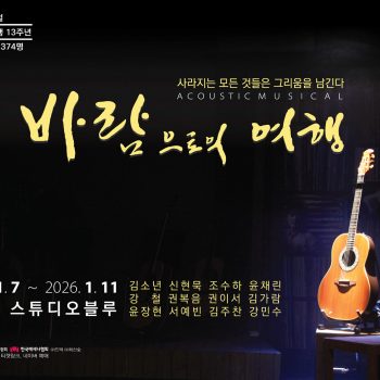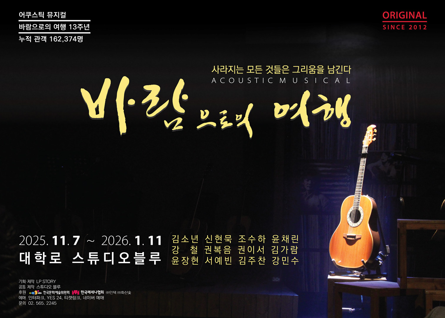 13년의 신화, 다시 불어오는 감성의 바람을 타고 어쿠스틱 뮤지컬 《바람으로의 여행》의 계절이 돌아왔다. 故 김광석의 목소리로 세대를 잇고 위로 해온 노래들이 다시 살아나는 무대인 《바람으로의 여행》이 오는 11월 7일부터 2026년 1월 11일까지 대학로 스튜디오 블루에서 공연된다.