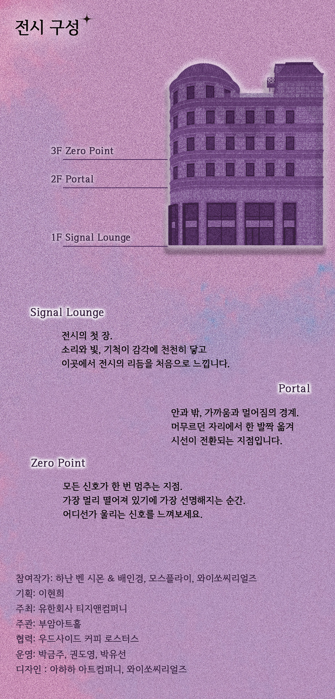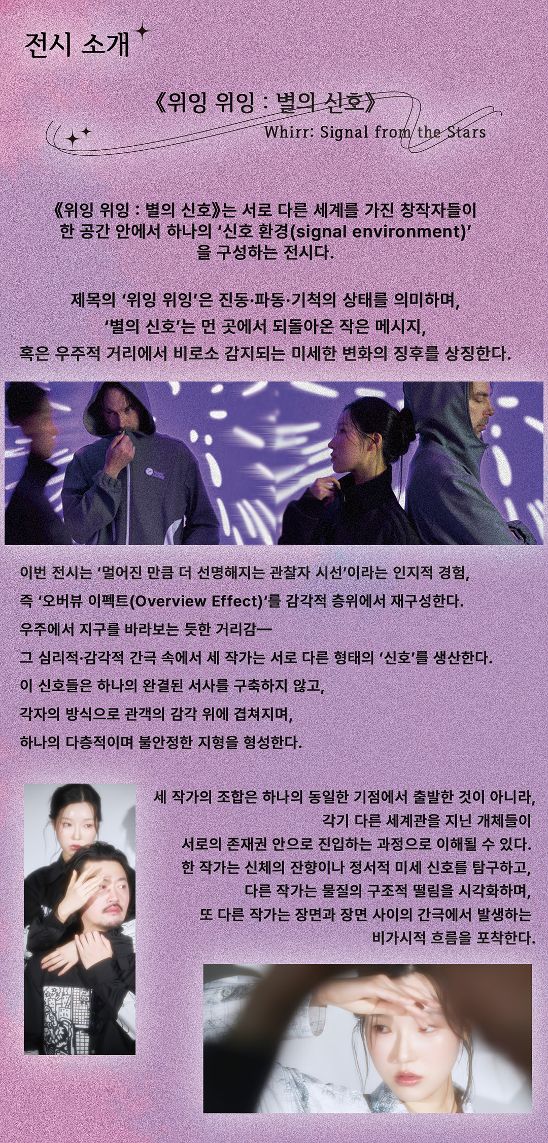 《위잉 위잉 : 별의 신호》는 서로 다른 세계를 가진 창작자들이한 공간 안에서 하나의 ‘신호 환경(signal environment)’을 구성하는 전시다.제목의 ‘위잉 위잉’은 진동·파동·기척의 상태를 의미하며,‘별의 신호’는 먼 곳에서 되돌아온 작은 메시지,혹은 우주적 거리에서 비로소 감지되는 미세한 변화의 징후를 상징한다.
