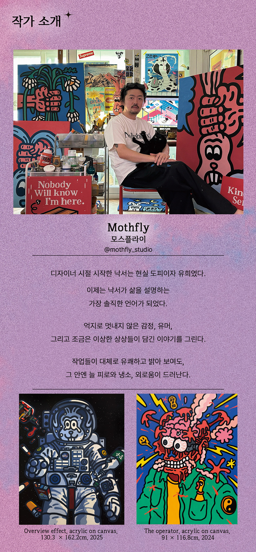 이번 전시는 ‘멀어진 만큼 더 선명해지는 관찰자 시선’이라는 인지적 경험,즉 ‘오버뷰 이펙트(Overview Effect)‘의 미학에서 출발한다.우주에서 지구를 바라보는 듯한 거리감—그 심리적·감각적 간극 속에서 세 작가는 서로 다른 형태의 ‘신호’를 생산한다.이 신호들은 하나의 완결된 서사를 구축하지 않고,각자의 방식으로 관객의 감각 위에 겹쳐지며, 하나의 다층적이며 불안정한 지형을 형성한다.