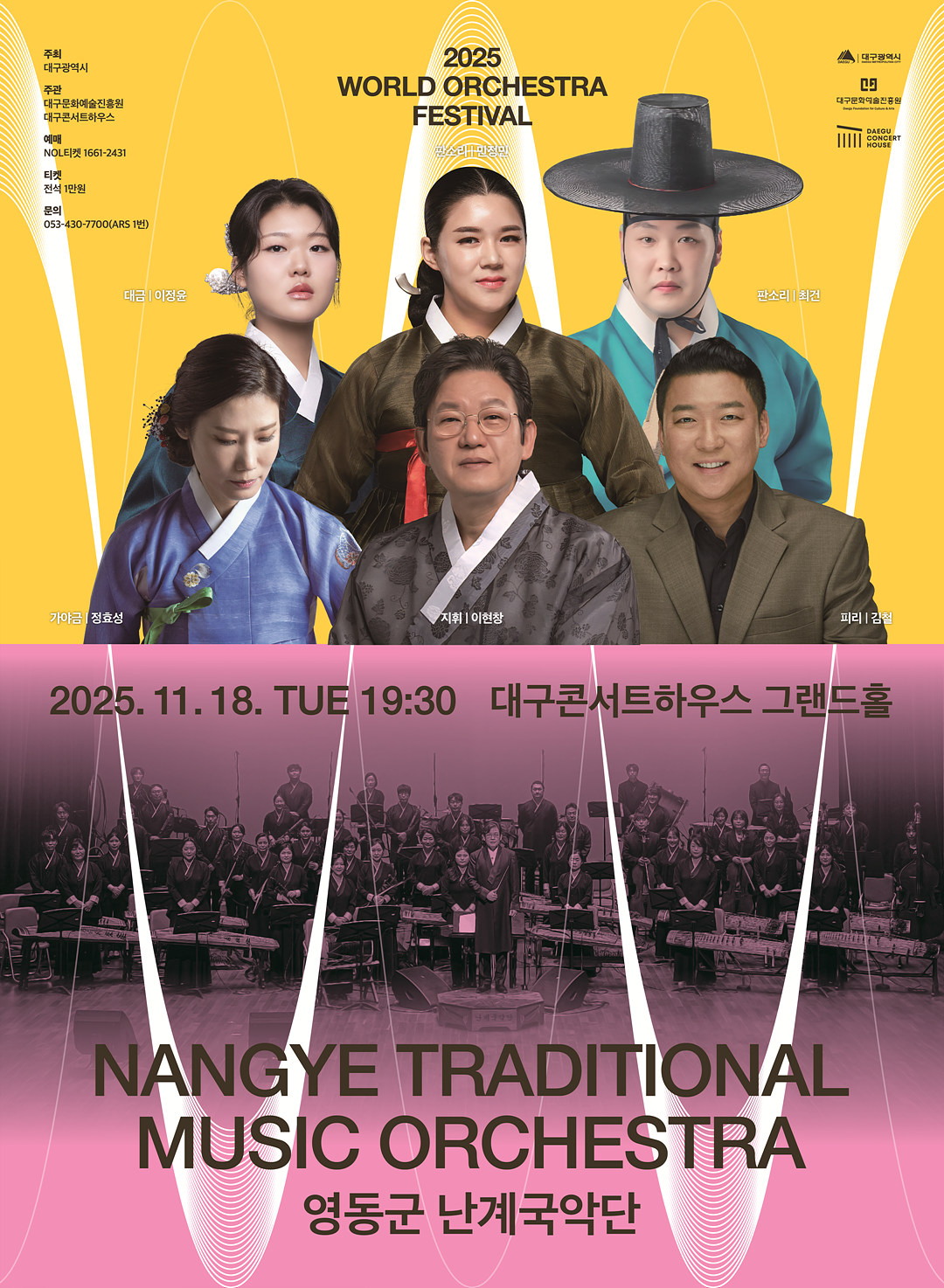 (재)대구문화예술진흥원 대구콘서트하우스(관장 박창근)는 오는 11월 18일(화) 저녁 7시 30분, 그랜드홀에서 ‘2025 월드오케스트라페스티벌’의 특별한 무대로 ‘영동군 난계국악단’의 공연을 개최한다.