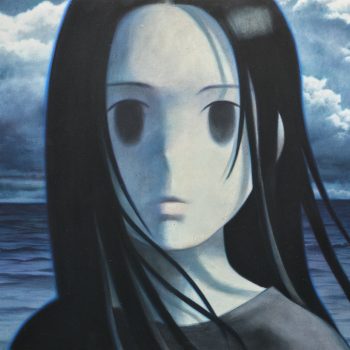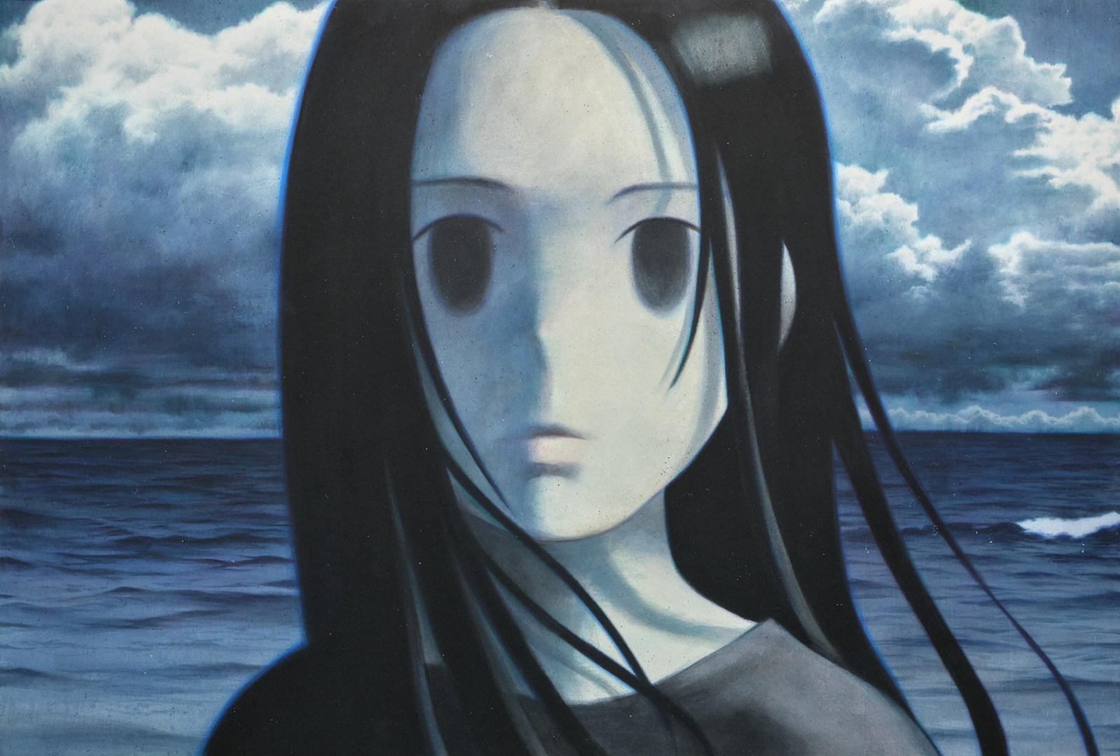 〈그날의 바다〉에 등장하는 긴 머리의 소녀는 화면 밖 어딘가를 멍하니 바라보고 있다. 그녀는 특정한 서사를 지닌 인물이라기보다, 인간과 비인간의 경계에 위치한 존재처럼 보인다. 실존 인물의 재현이라기보다 자연의 감응체에 가까운 이 형상은, 광활한 현실 앞에 놓인 개인의 상태를 상징적으로 드러낸다. 구름 사이로 스며드는 빛, 낮도 밤도 아닌 새벽의 시간대는 이 인물이 어느 한쪽으로 규정되지 않도록 만든다. 현오의 인물들은 종종 인간, 동물, 혹은 자연의 일부로 명확히 분류되기를 거부하며, 이러한 애매한 존재성은 전시 전반을 관통하는 중요한 시각적 전략이다.