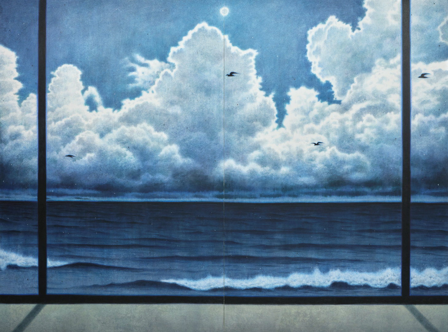 이번 전시에서 반복적으로 등장하는 공간은 바다이다. 그러나 이 바다는 감상적이거나 낭만적인 자연이 아니다. 화면 속 바다는 일식과 월식의 시간대를 통과하며, 낮과 밤의 경계에 놓인 채 묘사된다. 빛은 완전히 사라지지 않지만, 충분히 약화된 상태로 존재한다. 이 빛의 약화는 장면을 어둡게 만들기보다는 오히려 인물과 사물의 윤곽을 또렷하게 드러낸다. 빛이 가려지는 이 순간은 소멸이 아니라 분리의 조건이 된다. 집단의 일부로 인식되던 존재는 이 경계의 시간 속에서 주변으로부터 분리되어, 개별적인 존재로 떠오른다.