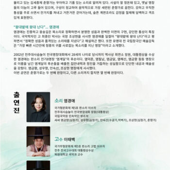 염경애는 강인한 통성과 정확하면서 분명한 성음, 이면의 완벽한 구현으로 관객을 사로잡는 소리꾼입니다. 판소리 최고의 등용문인 전주대사습놀이 전국명창대회에서 28세이던 2002년 사상 최연소 장원을 차지해 이목을 집중시킨 주인공이자 판소리역사의 전기 8명창 중 한 사람인 염계달의 후손이기도 합니다. 귀명창들이 기다려온 무대, 염경애의 이번 공연은 판소리의 우뚝한 경지를 유감없이 보여줄 것입니다.