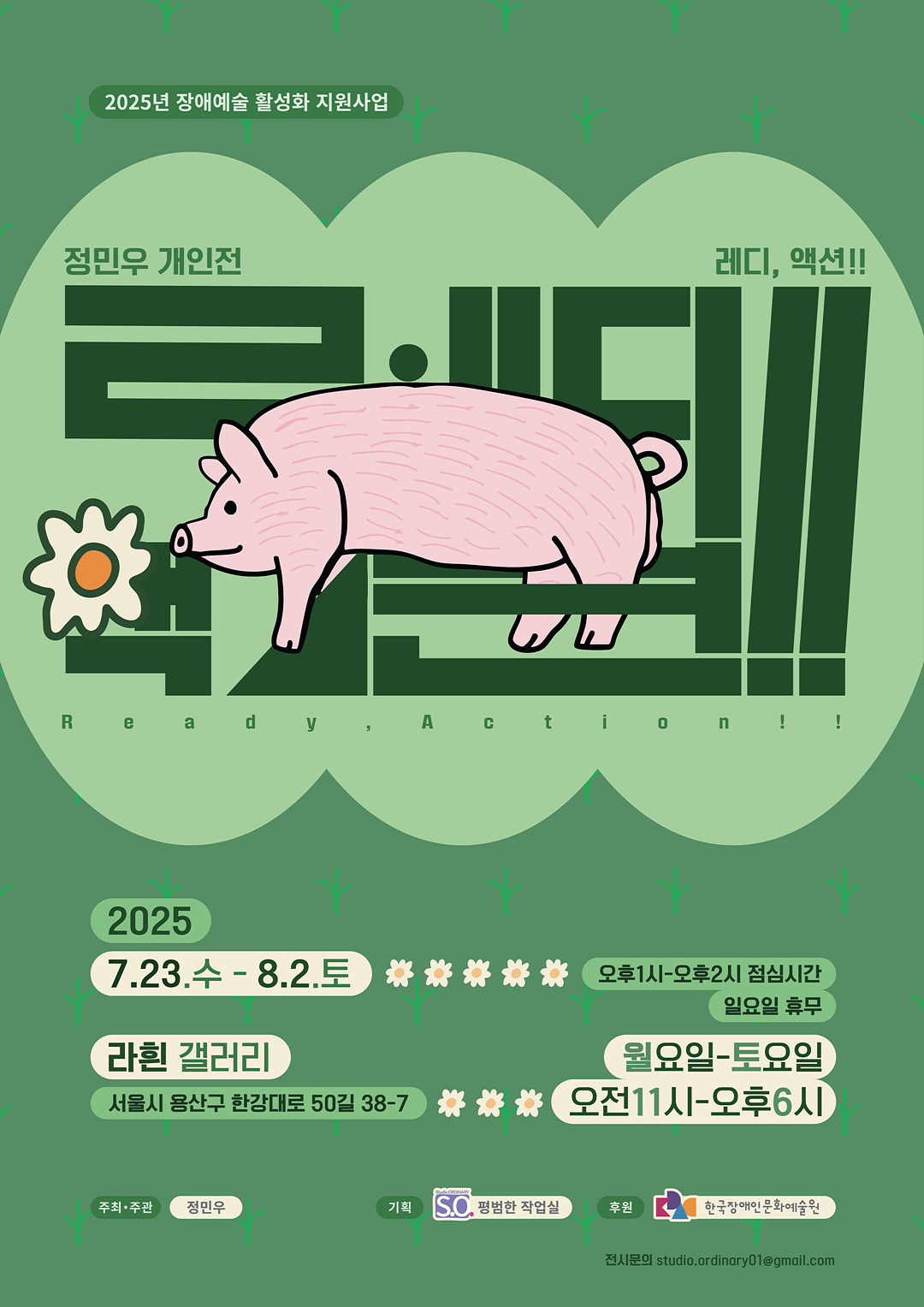 결국 〈레디, 액션!!〉은 하나의 선언이다. 정민우는 더 이상 ‘완성본을 꺼내 놓는’ 화가에 머무르지 않는다. 그는 평면 이미지를 깨워 시간 속으로 밀어 넣고, 그 과정에서 관객을 동등한 플레이어로 초대한다. 스튜디오와 전시장, 화면과 모니터, 일상과 팝컬처, 장애예술과 현대미술 사이에 팽팽히 걸린 줄 위에서 그는 경쾌하게 균형을 잡는다. 촬영 구호는 이미 울렸다. 그러니 큐 사인을 들은 우리는 이제 답해야 할 차례다. 정지 버튼을 누르지 말 것. 이 전시는 시작 신호와 함께 움직이는 중이며 ‘액션’은우리의 몫이다.