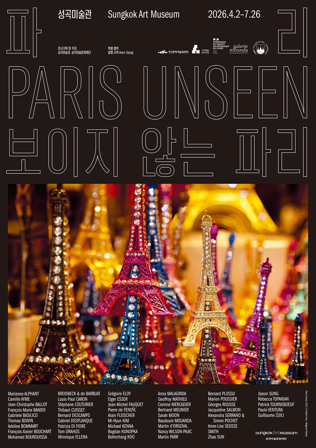 사진, 영상, 설치와 사운드로 구성된 이번 전시는 카메라의 단순한 기록을 넘어, 서로 다른 시선과 전략을 통해 도시를 사유하는 장을 펼쳐 보입니다. 하나의 도시를 둘러싼 다양한 해석이 공존하는 이 자리에서 관람객 여러분께서 ‘보이지 않았던 파리’를 발견하는 뜻깊은 시간이 되기를 바랍니다. (성곡미술관)