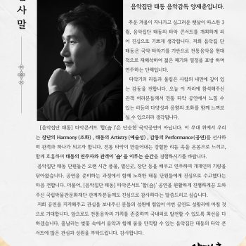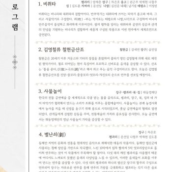 한국의 전통 공연예술 중 세계적으로 각광받는 풍물음악으로 꽹과리, 장구,북,징의 네 가지 타악기가 협력해서 만드는 소리가 조화를 이루는 것이 특징이다. 오늘 공연에서는 태동영재단의 영남 사물놀이 가락을 감상할 수 있다.
