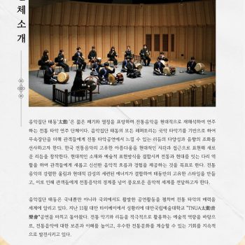 사물놀이와 라틴리듬의 조화로 흥을 극대화한 태동의 대표작품이다. 타악기의 강렬함과 특수악기의 활용으로 관객들에게 음향의 다채로움을 선사하며 공연의 대미를 장식하고자 한다.