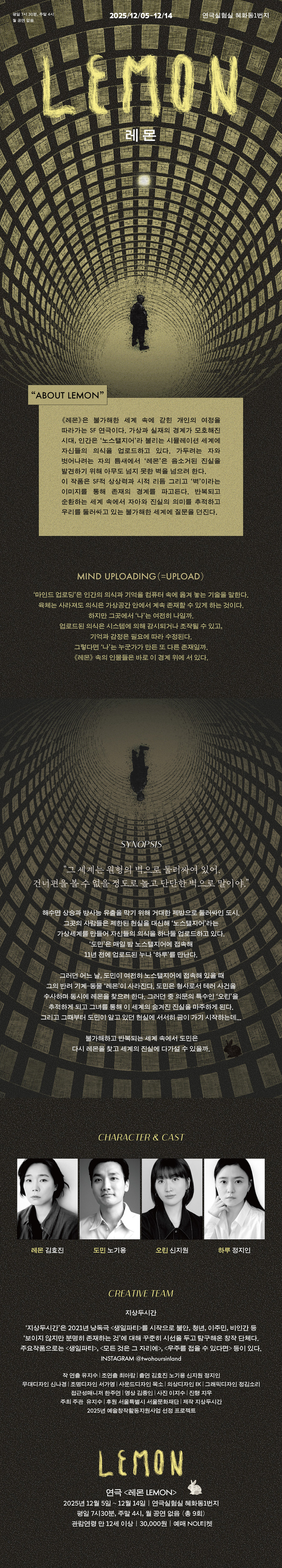 《레몬》은 불가해한 세계 속에 갇힌 개인의 여정을 따라가는 SF 연극이다. 가상과 실재의 경계가 모호해진 시대, 인간은 ‘노스탤지어’라 불리는 시뮬레이션 세계에 자신들의 의식을 업로드하고 있다. 가두려는 자와 벗어나려는 자의 틈새에서 ‘레몬’은 음소거된 진실을 발견하기 위해 아무도 넘지 못한 벽을 넘으려 한다. 이 작품은 SF적 상상력과 시적 리듬 그리고 ‘벽’이라는 이미지를 통해 존재의 경계를 파고든다. 반복되고 순환하는 세계 속에서 ‘자아’와 ‘진실’의 의미를 추적하고 우리를 둘러싸고 있는 불가해한 세계에 질문을 던진다.