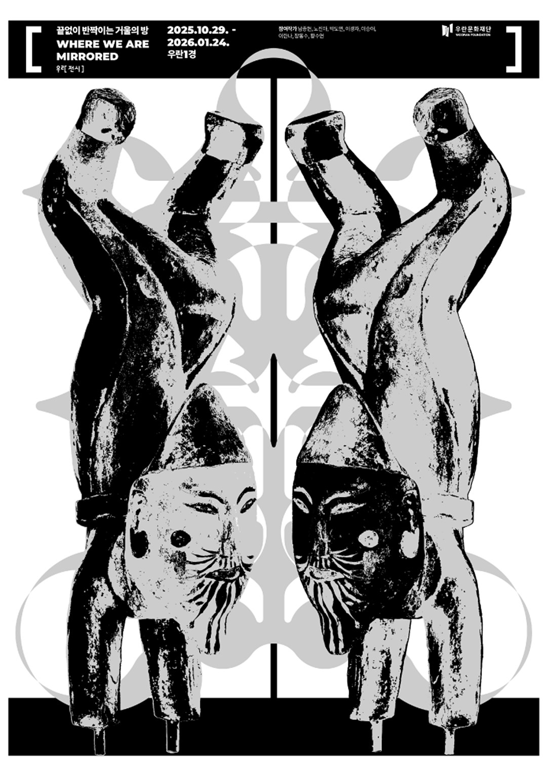 전시 《끝없이 반짝이는 거울의 방》은 꼭두와 동자석을 현대 미술의 언어로 재해석하며, 인간이 만들어낸 ‘대리하는 몸’의 의미를 성찰한다. 여덟 명의 현대 작가는 각기 다른 방식으로 꼭두와 동자석이 품고 있던 ‘몸’의 의미를 확장하며, 전시는 이들의 작품이 유물과 마주하는 장이 된다. 저승을 또 다른 삶의 세계로 바라보는 전통적 생명관과 현대의 예술적 감각이 만나는 이 지점에서, 우리는 유한한 삶을 초월한 존재의 가능성과 시공간을 뛰어 넘으려는 인간 정신의 흐름을 발견하게 될 것이다.