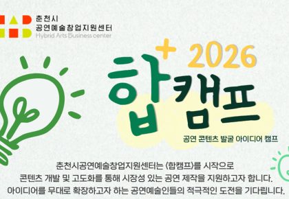춘천시공연예술창업지원센터(합센터)는 공연 콘텐츠 아이디어 발굴 및 콘텐츠 기획안 고도화를 통해 시장성 있는 신규 콘텐츠 제작을 지원하기 위한 2026 합캠프를 2026년 ...