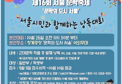 제16회 서울문학축제 ‘서울시민과 함께하는 낭독’ 대회의 작품을 공모한다. 이번 대회는 시민들이 직접 참여하여 낭독의 아름다움을 선보이는 특별한 행사로서, 10월 10일까지 이메일로 접수하며 비대면 예선을 통해 본선 진출자를 선발한다.