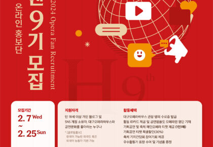 대구오페라하우스가 온라인 홍보단 ‘오페라팬’ 9기를 모집한다. 오페라팬(OperaFan)은 오페라와 공연문화를 즐기는 사람들을 가리키는 말로, 온라인 상에서 대구오페라하우스 기획공연 및 대구국제오페라축제 등의 홍보를 돕는 서포터즈를 일컫는다.