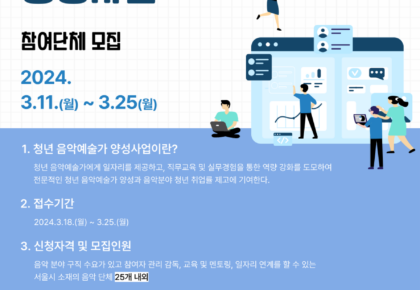 (사)한국음악협회는 음악 전공 청년을 음악 관련 단체에 배치하여, 음악 분야 청년 취업률 제고에 기여하기 위한 「2024 청년음악예술가 양성사업」의 참여단체를 모집합니다.