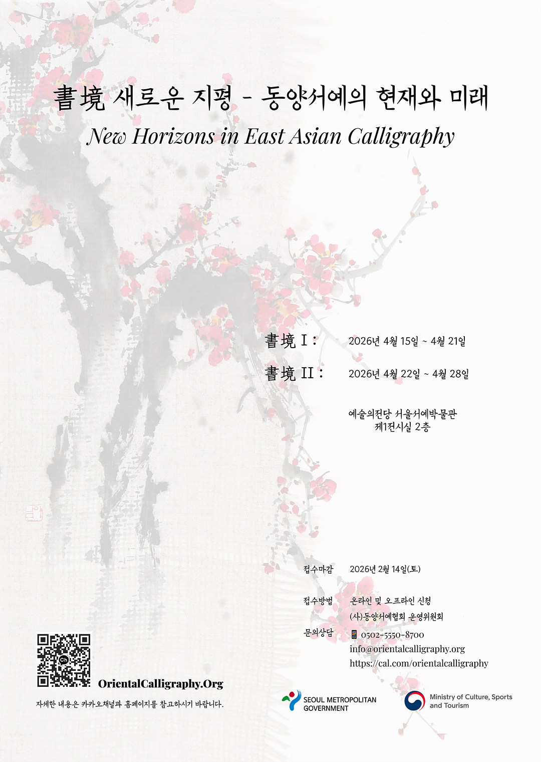 사단법인 동양서예협회(The Asian Society of Calligraphic Arts)가 주최하고 문화체육관광부와 서울특별시가 후원하는 「제23회 대한민국 동양서예대전 – 書境 새로운 지평: 동양서예의 현재와 미래」가 오는 2026년 4월 15일(수)부터 4월 28일(화)까지 개최됩니다.