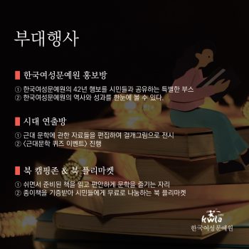 한국여성문예원의 42년 행보를 시민들과 공유하는 특별한 부스로서, 그동안 치른 행사의 포스터를 편집하여 걸개그림으로 전시하고, 활동했던 사진과 출판한 책 등을 전시한다. 이 부스를 통해 한국여성문예원의 역사와 성과를 한눈에 볼 수 있으며, 문학적 여정을 함께 나눌 수 있다.