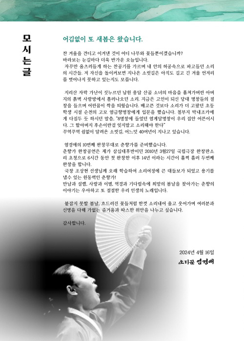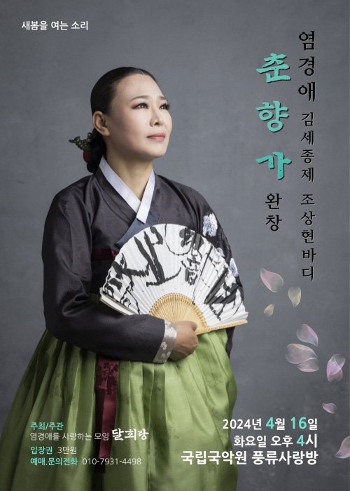 중견명창 가운데 가장 튼실한 목과 아름다운 소리태를 지녔다는 평을 듣는 염경애 명창이 우아하고 기품있는 판소리로 꼽히는 김세종제 춘향가를 6시간에 걸쳐 완창하는 공연이 4월 16일 국립국악원 풍류사랑방에서 열립니다. 염 명창의 판소리 완창은 춘향가로는 2010년 국립극장 초청 완창판소리 이후 14년 만이고, 수궁가 심청가 등 다른 소리까지 합치면 열 번째 완창입니다.