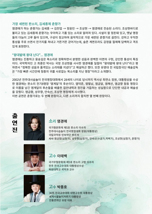 염경애는 강인한 통성과 정확하면서 분명한 성음, 이면의 완벽한 구현으로 관객을 사로잡는 소리꾼입니다. 판소리 최고의 등용문인 전주대사습놀이 전국명창대회에서 28세이던 2002년 사상 최연소 장원을 차지해 이목을 집중시킨 주인공이자 판소리역사의 전기 8명창 중 한 사람인 염계달의 후손이기도 합니다. 귀명창들이 기다려온 무대, 염경애의 이번 공연은 판소리의 우뚝한 경지를 유감없이 보여줄 것입니다.
