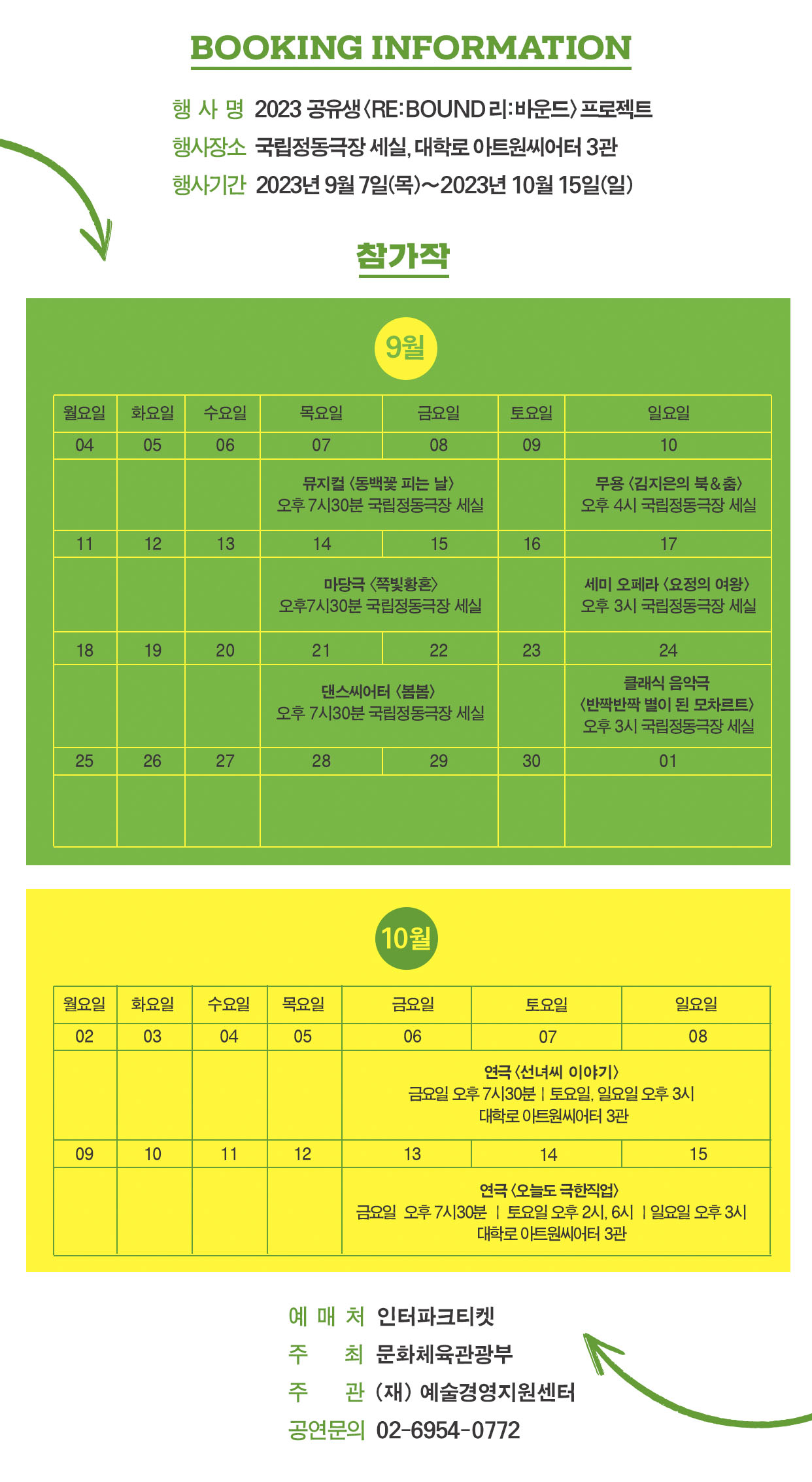 ● 내용 : 9월 국립정동극장 세실(연극 3편, 음악다원 3편) 및 10월 대학로 아트원씨어터 3관(연극 2편) 공연 진행