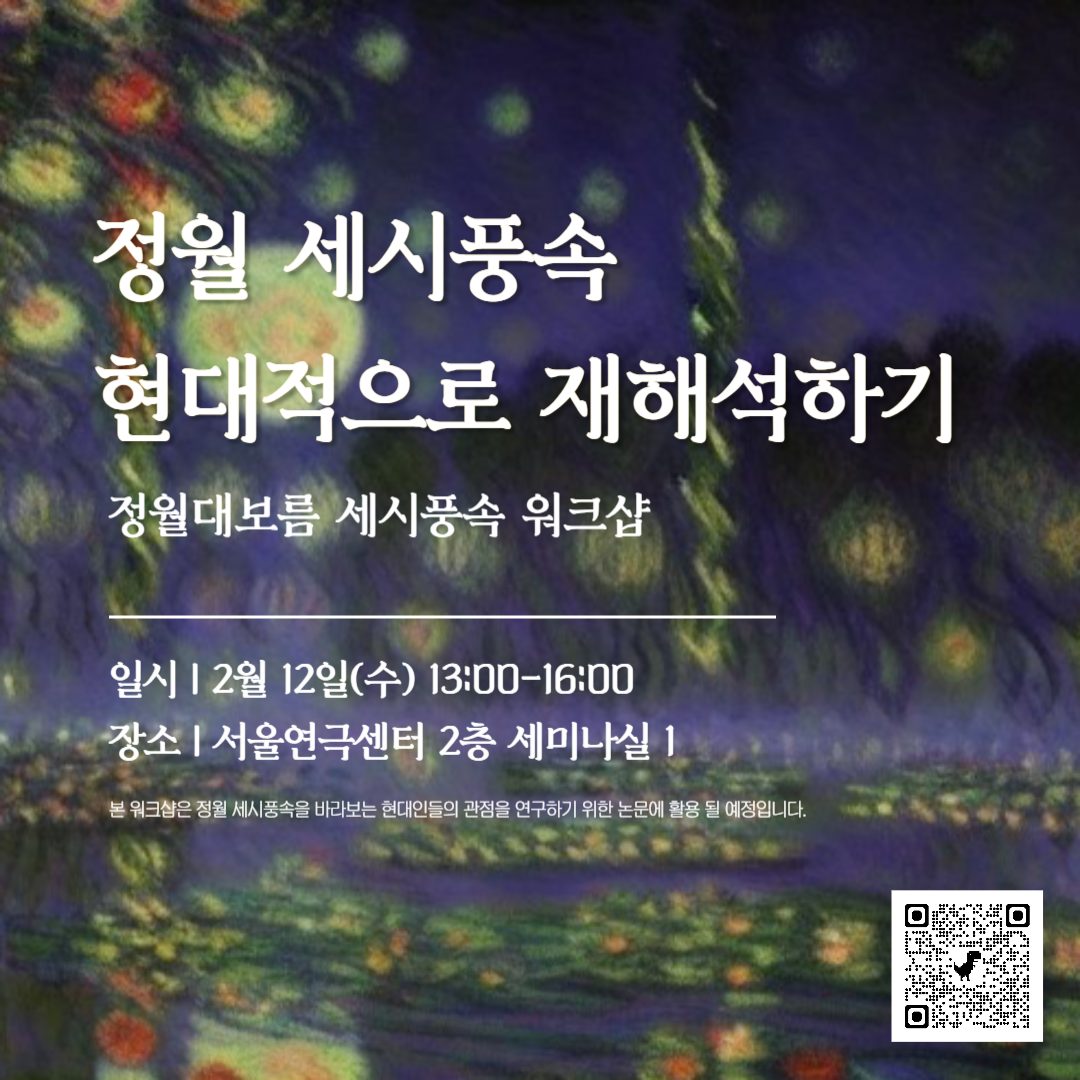 2월 12일(수) 정월 대보름을 맞아 <정월 세시풍속 현대적으로 재해석하기> 워크샵이 서울 연극센터(서울 종로구 대명길3) 2층 세미나실1에서 진행된다.