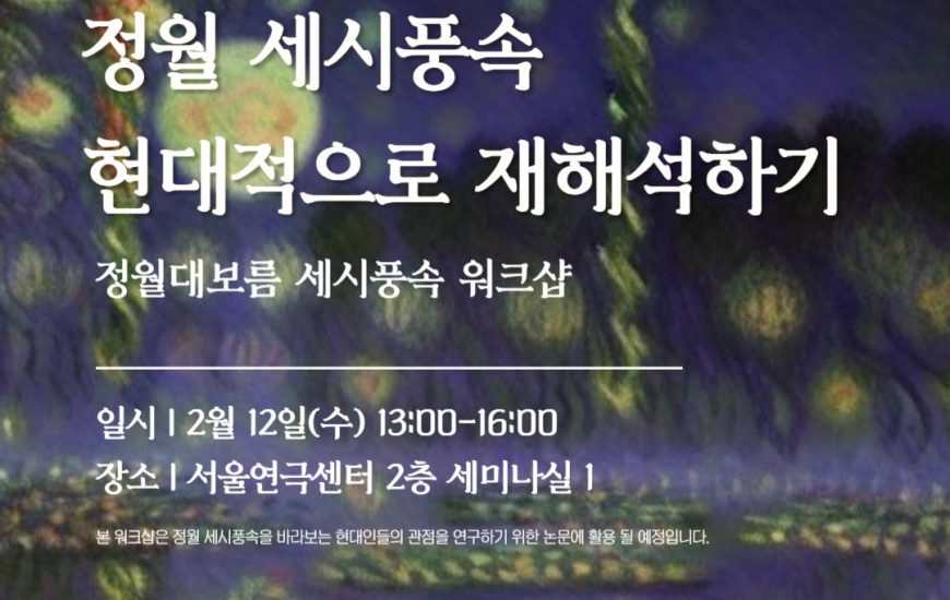 2월 12일(수) 정월 대보름을 맞아 '정월 세시풍속 현대적으로 재해석하기' 워크샵이 서울 연극센터(서울 종로구 대명길3) 2층 세미나실1에서 진행된다.