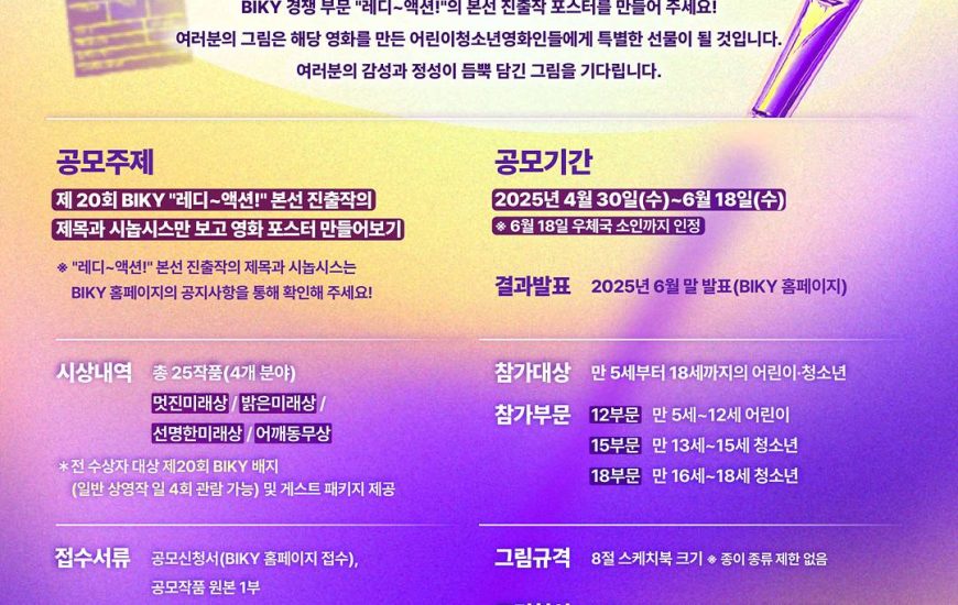 부산국제어린이청소년영화제(BIKY)는 4월 30일부터 6월 18일까지 영화 포스터 그림 공모전을 실시한다. 참가자는 BIKY 경쟁부문 “레디~액션!”의 본선 진출작의 제목과 시놉시스를 보고 해당 영화의 포스터 그림을 만들면 된다.